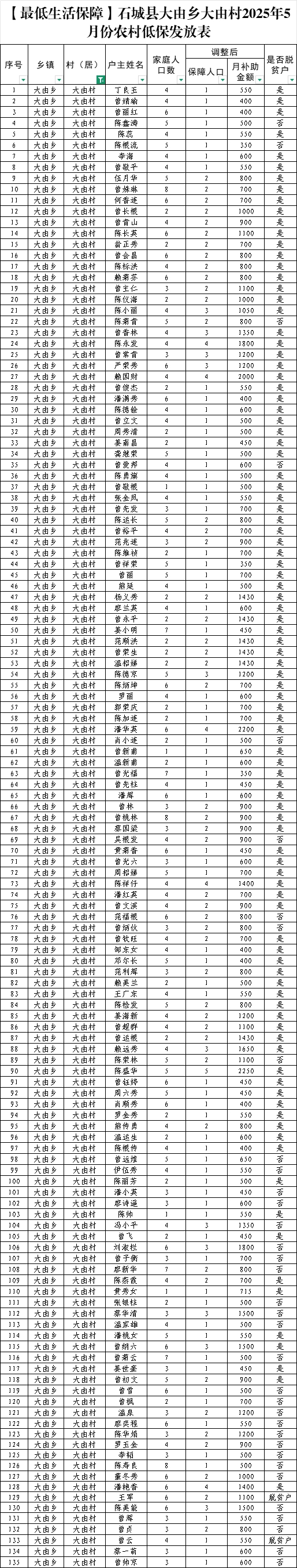 【最低生活保障】石城縣大由鄉(xiāng)大由村2025年5月份農(nóng)村低保發(fā)放表
