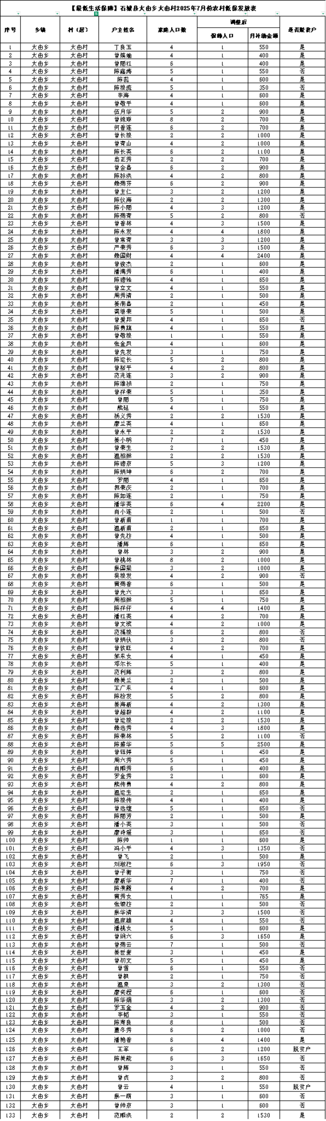 【最低生活保障】石城縣大由鄉(xiāng)大由村2025年7月份農(nóng)村低保發(fā)放表