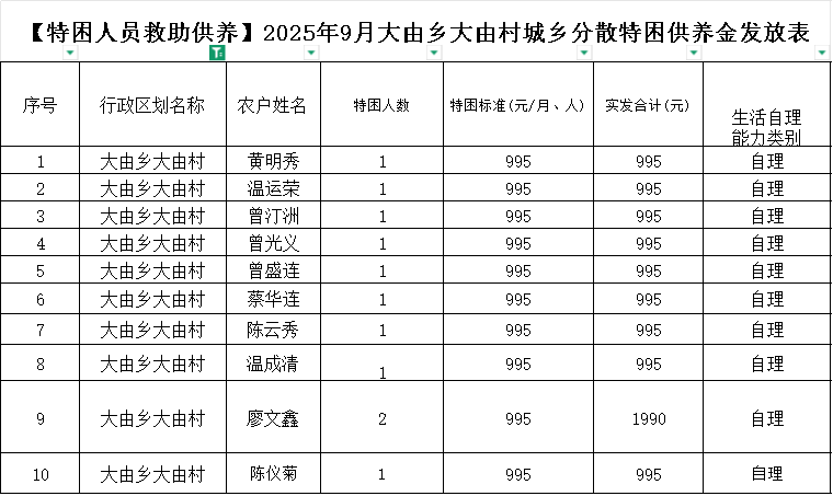 【特困人員救助供養(yǎng)】2025年9月大由鄉(xiāng)大由村城鄉(xiāng)分散特困供養(yǎng)金發(fā)放表