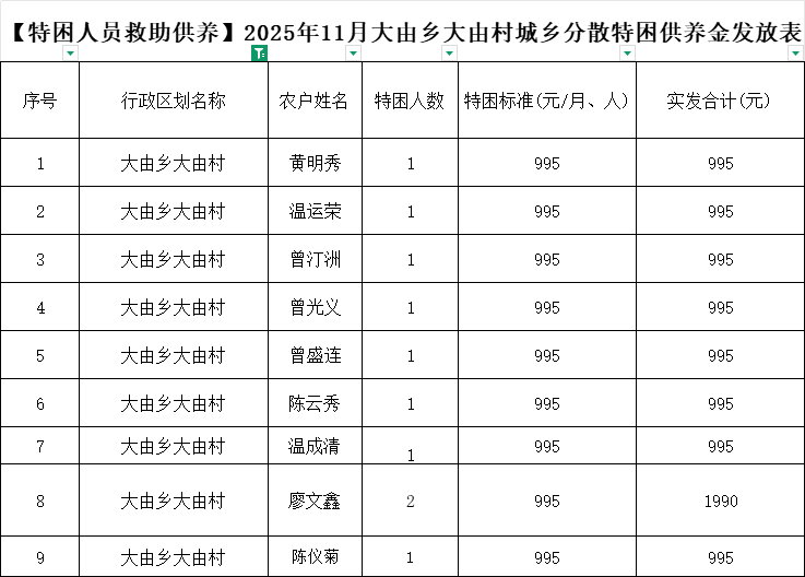 【特困人員救助供養(yǎng)】2025年11月大由鄉(xiāng)大由村城鄉(xiāng)分散特困供養(yǎng)金發(fā)放表