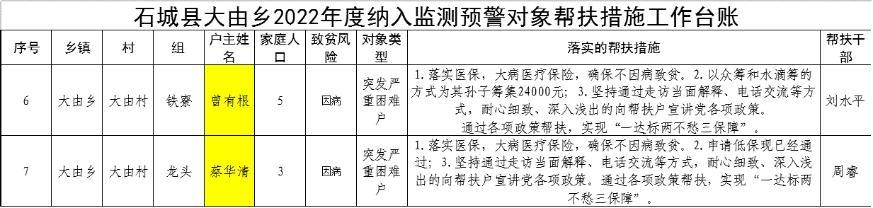 石城縣大由鄉(xiāng)大由村2022年度納入監(jiān)測預(yù)警對象幫扶措施工作臺賬