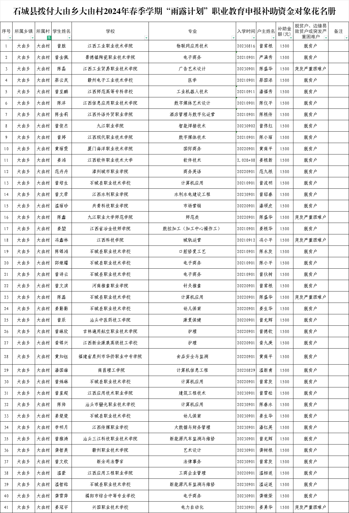石城縣撥付大由鄉(xiāng)大由村2024年春季學(xué)期“雨露計(jì)劃”職業(yè)教育申報(bào)補(bǔ)助資金對(duì)象花名冊(cè)