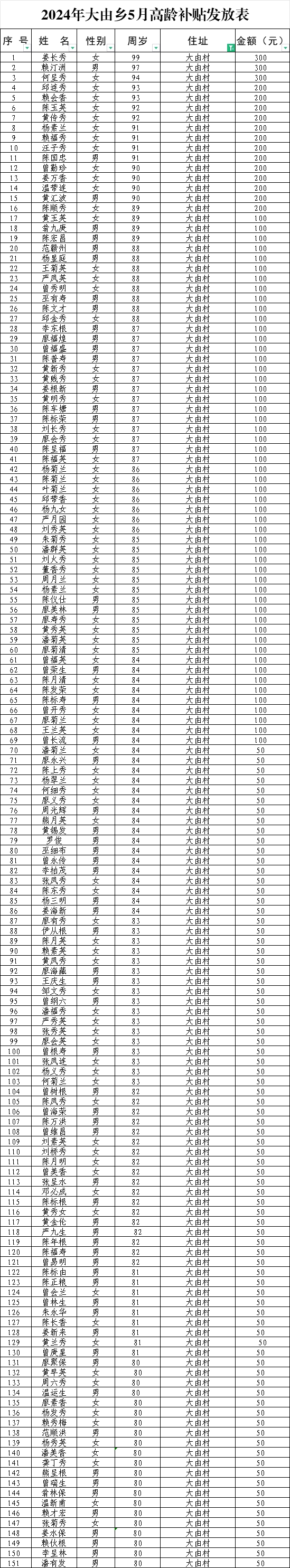 【老年人申領(lǐng)補(bǔ)貼和發(fā)放信息】2024年大由鄉(xiāng)大由村5月高齡補(bǔ)貼發(fā)放表