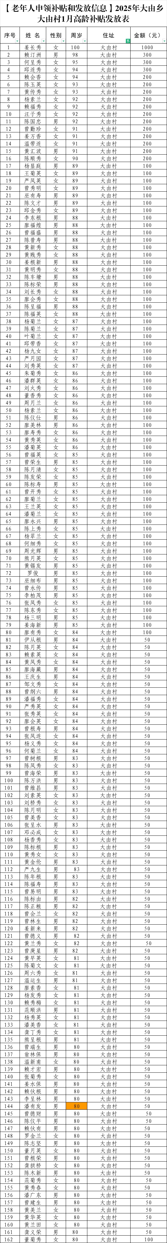 【老年人申領(lǐng)補(bǔ)貼和發(fā)放信息】2025年大由鄉(xiāng)大由村1月高齡補(bǔ)貼發(fā)放表