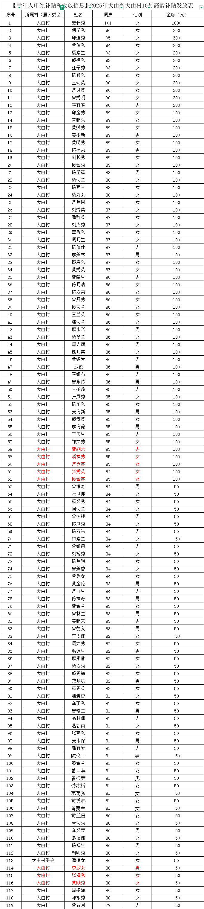 【老年人申領(lǐng)補(bǔ)貼和發(fā)放信息】2025年大由鄉(xiāng)大由村10月高齡補(bǔ)貼發(fā)放表