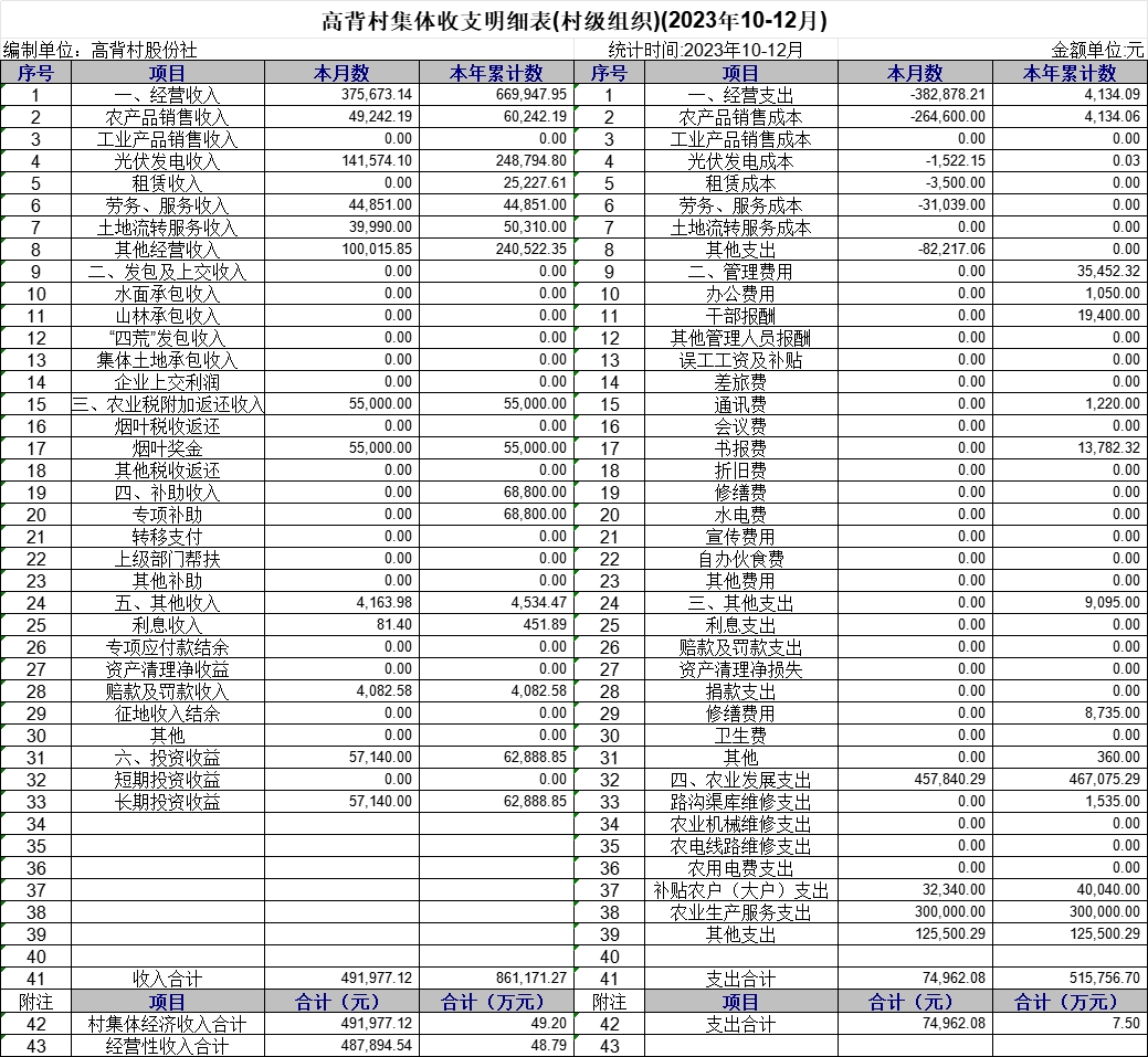 大由鄉(xiāng)高背村2023年10-12月收支明細
