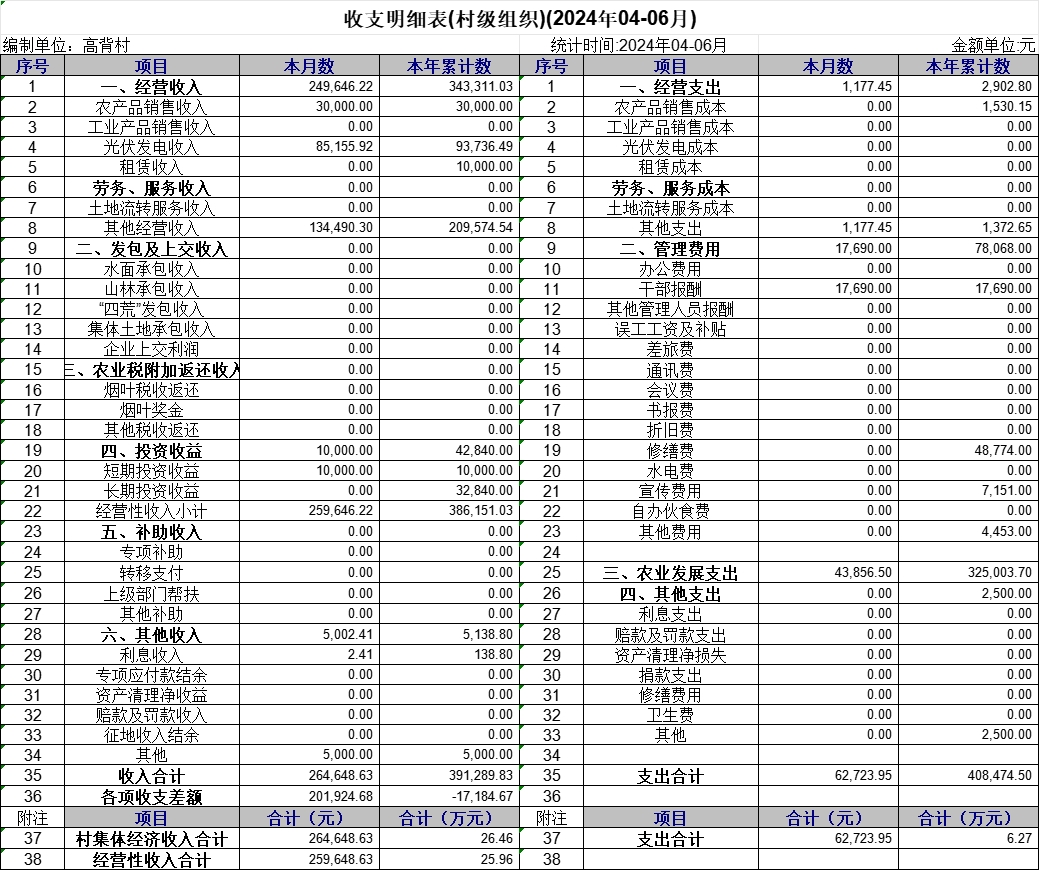 大由鄉(xiāng)高背村2024年4-6月收支明細(xì)