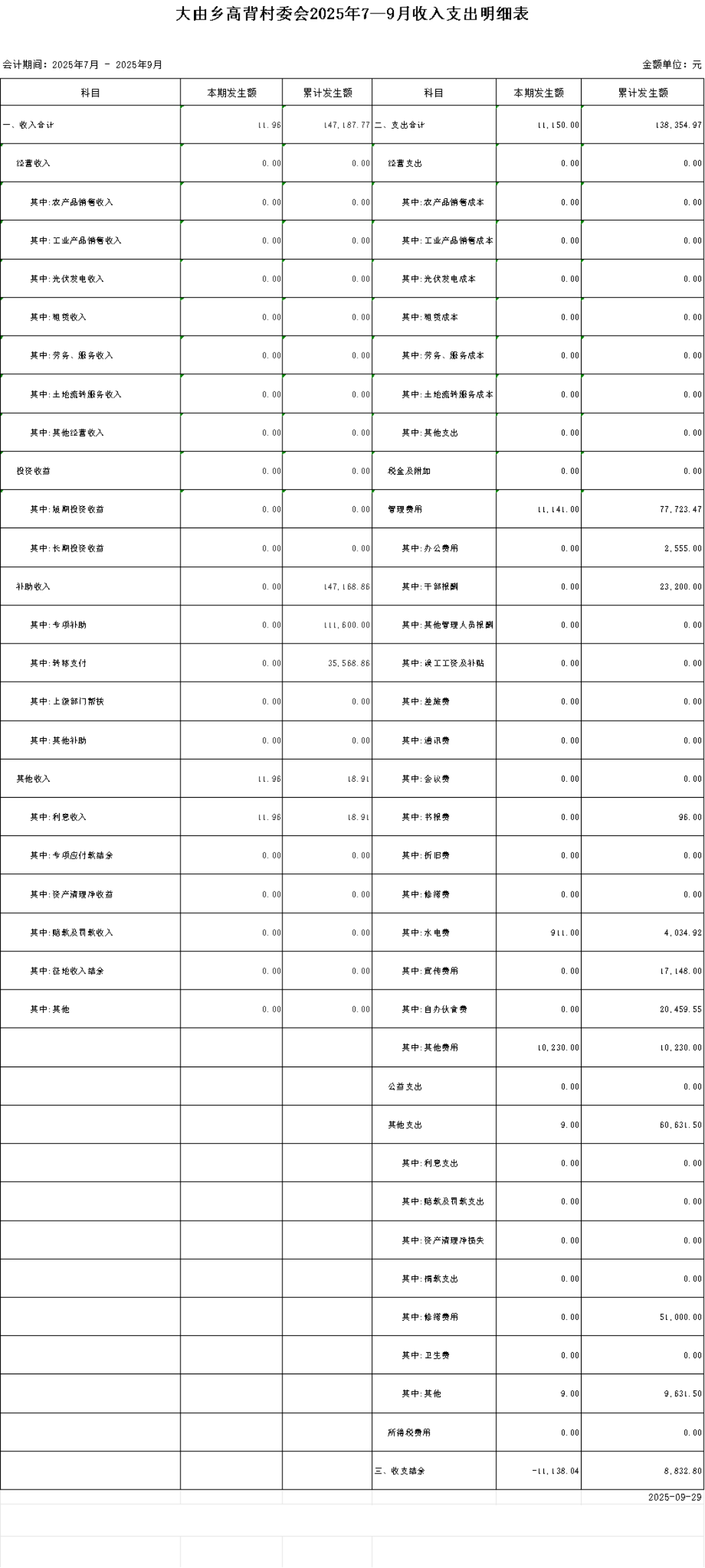 大由鄉(xiāng)高背村委會2025年7—9月收入支出明細表