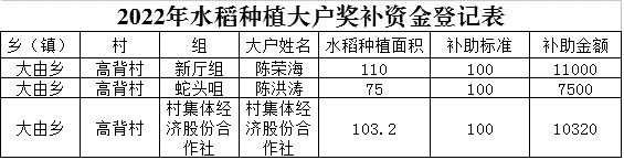 大由鄉(xiāng)高背村2022年水稻種植大戶獎補(bǔ)資金登記表