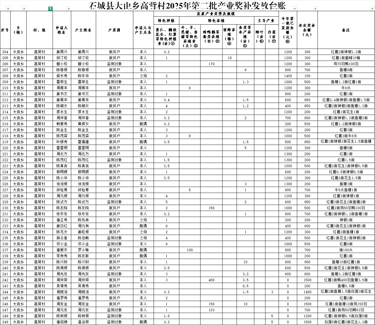 石城縣大由鄉(xiāng)高背村2025年第二批產(chǎn)業(yè)獎補(bǔ)發(fā)放臺賬