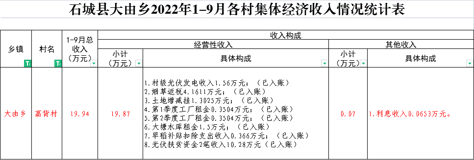 石城縣大由鄉(xiāng)2022年1-9月高背村集體經(jīng)濟收入情況統(tǒng)計表