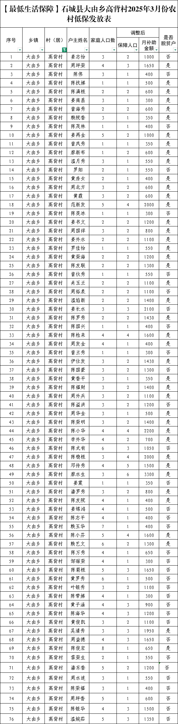 【最低生活保障】石城縣大由鄉(xiāng)高背村2025年3月份農(nóng)村低保發(fā)放表