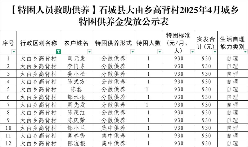 【特困人員救助供養(yǎng)】石城縣大由鄉(xiāng)高背村2025年4月城鄉(xiāng)特困供養(yǎng)金發(fā)放公示表