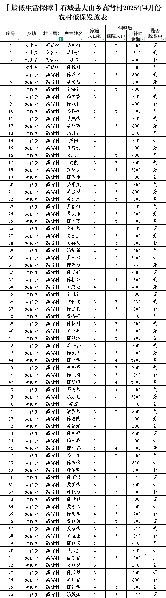 【最低生活保障】石城縣大由鄉(xiāng)高背村2025年4月份農(nóng)村低保發(fā)放表