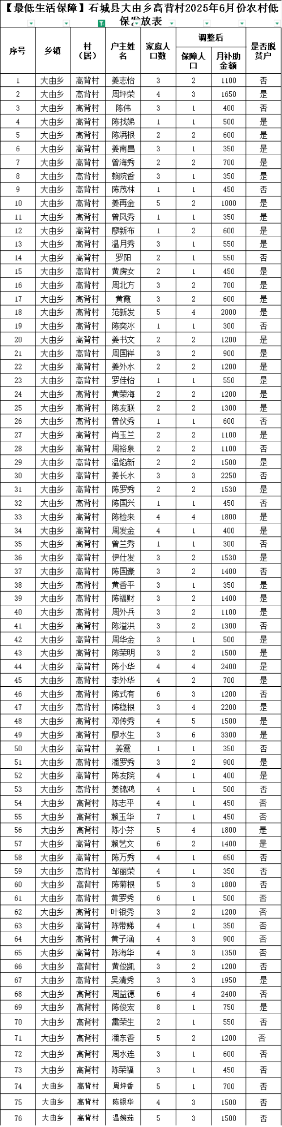 【最低生活保障】石城縣大由鄉(xiāng)高背村2025年6月份農(nóng)村低保發(fā)放表