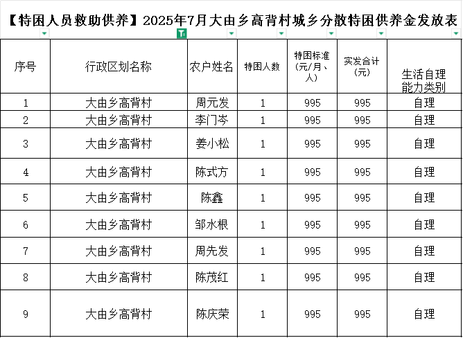 【特困人員救助供養(yǎng)】2025年7月大由鄉(xiāng)高背村城鄉(xiāng)分散特困供養(yǎng)金發(fā)放表