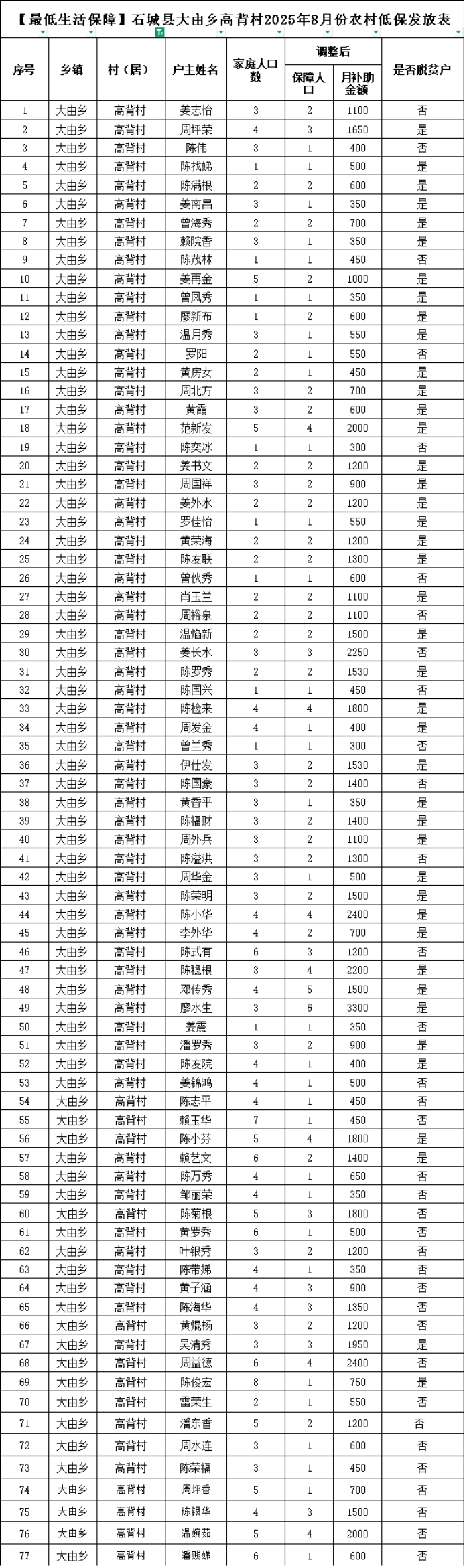 【最低生活保障】石城縣大由鄉(xiāng)高背村2025年8月份農(nóng)村低保發(fā)放表