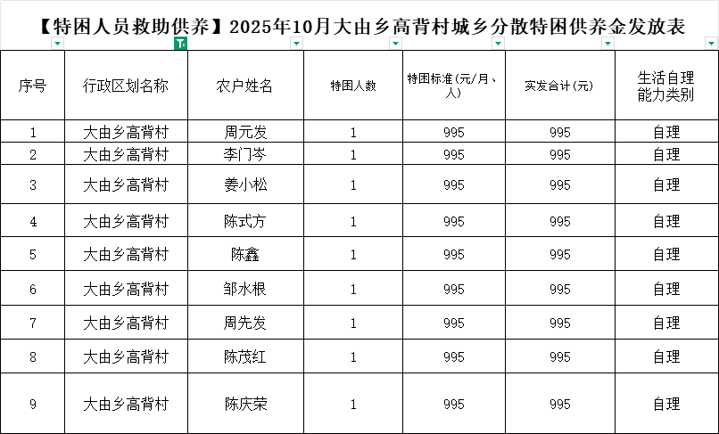 【特困人員救助供養(yǎng)】2025年10月大由鄉(xiāng)高背村城鄉(xiāng)分散特困供養(yǎng)金發(fā)放表