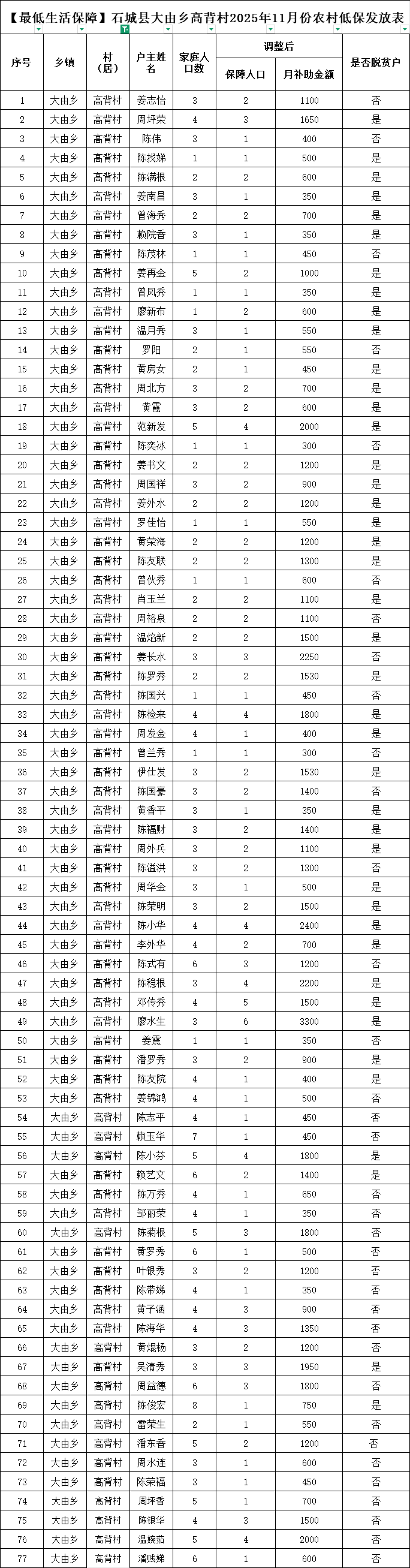 【最低生活保障】石城縣大由鄉(xiāng)高背村2025年11月份農(nóng)村低保發(fā)放表