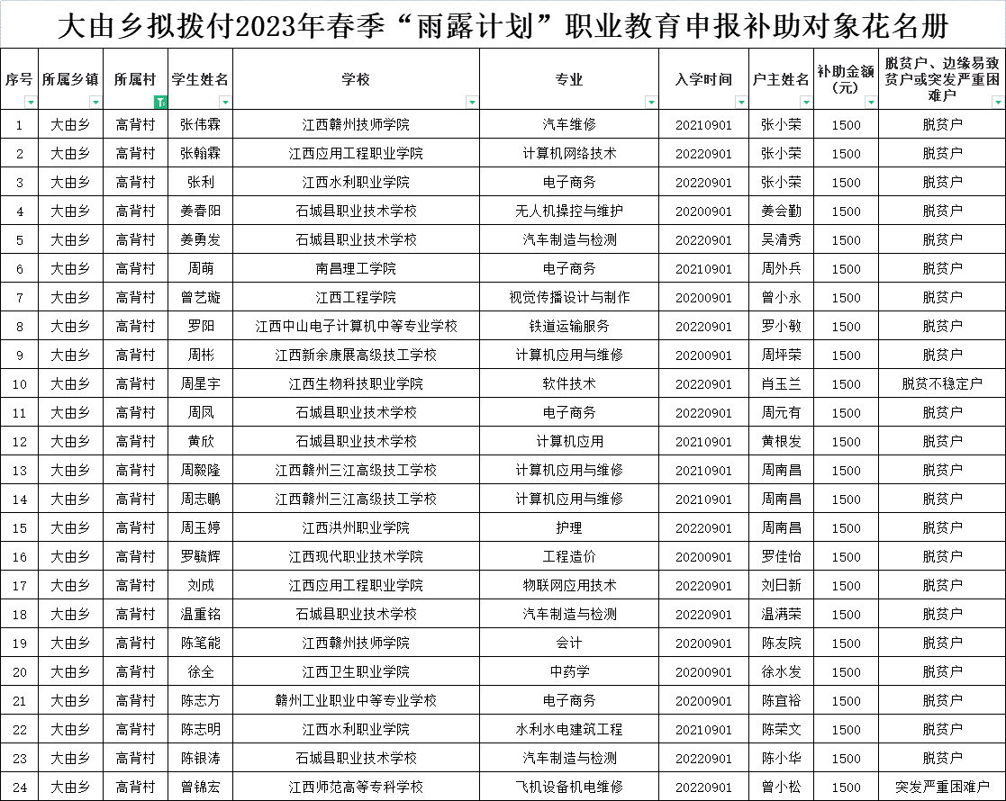 大由鄉(xiāng)高背村擬撥付2023年春季“雨露計劃”職業(yè)教育申報補助對象花名冊
