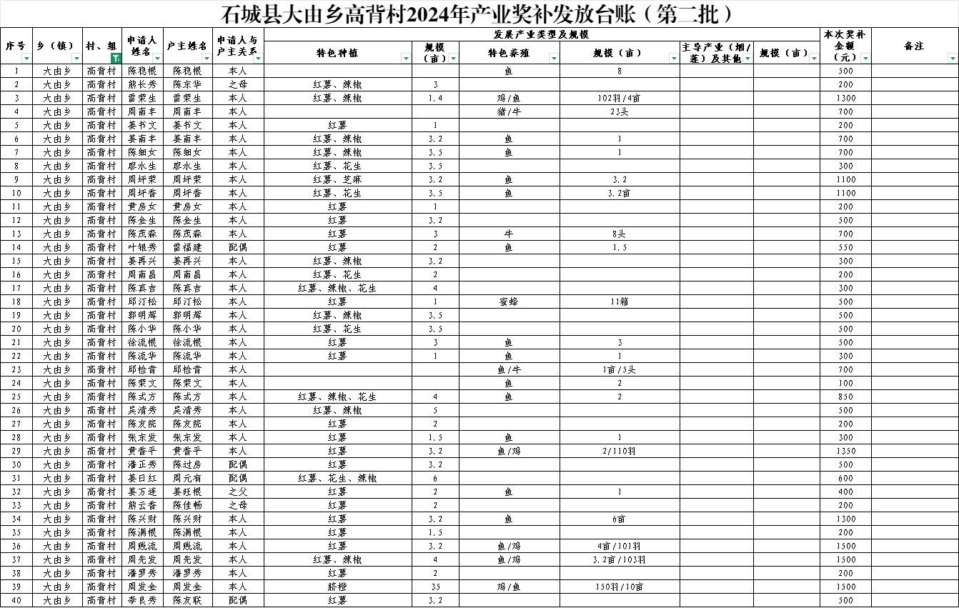 石城縣大由鄉(xiāng)高背村2024年產(chǎn)業(yè)獎補發(fā)放臺賬(第二批)