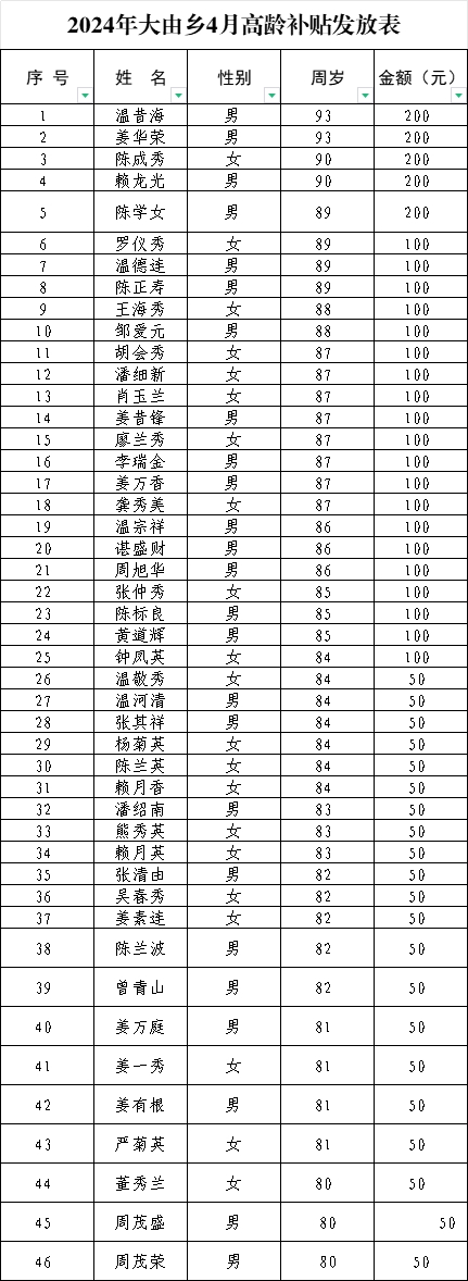 【老年人申領(lǐng)補(bǔ)貼和發(fā)放信息】2024年大由鄉(xiāng)高背村4月高齡補(bǔ)貼發(fā)放表