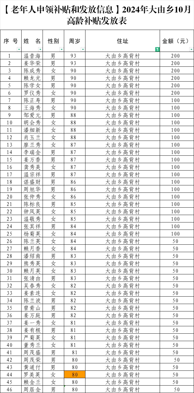 【老年人申領(lǐng)補(bǔ)貼和發(fā)放信息】2024年大由鄉(xiāng)高背村10月高齡補(bǔ)貼發(fā)放表