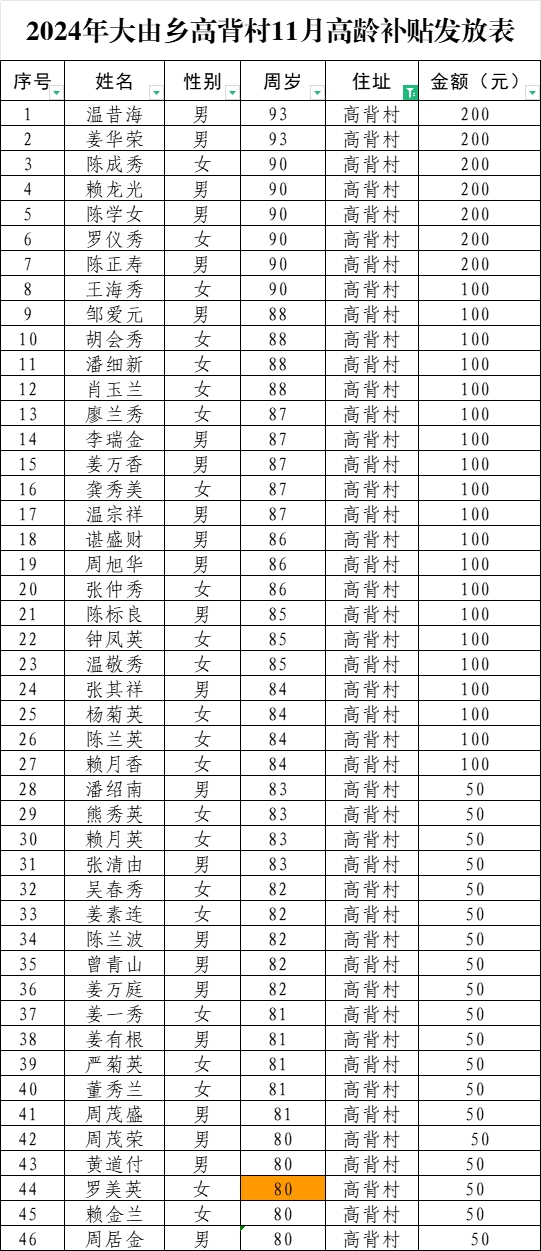 【老年人申領(lǐng)補(bǔ)貼和發(fā)放信息】2024年大由鄉(xiāng)高背村11月高齡補(bǔ)貼發(fā)放表