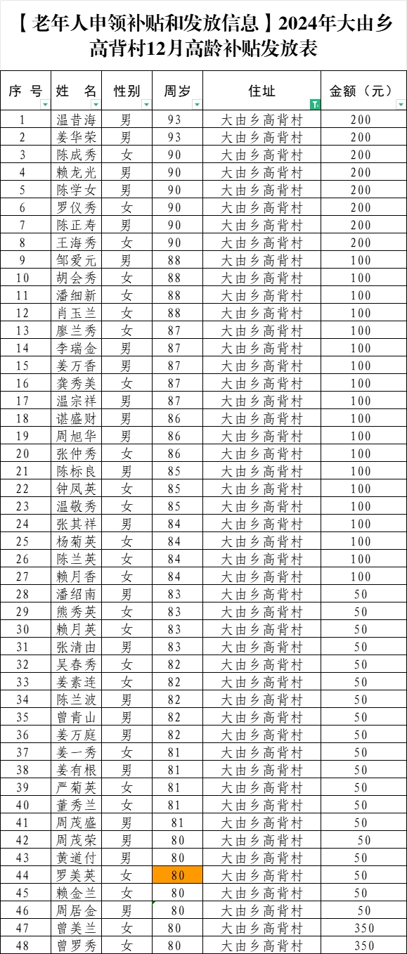 【老年人申領(lǐng)補(bǔ)貼和發(fā)放信息】2024年大由鄉(xiāng)高背村12月高齡補(bǔ)貼發(fā)放表