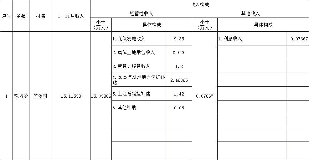 【集體統(tǒng)一經(jīng)營性資產(chǎn)】石城縣珠坑鄉(xiāng)竹溪村2022年1—11月村集體經(jīng)濟(jì)收入情況公示表