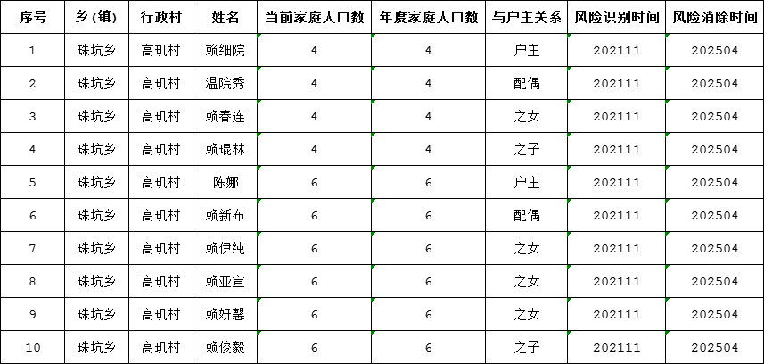 珠坑鄉(xiāng)高璣村2025年1-5月消除監(jiān)測(cè)對(duì)象名單公示