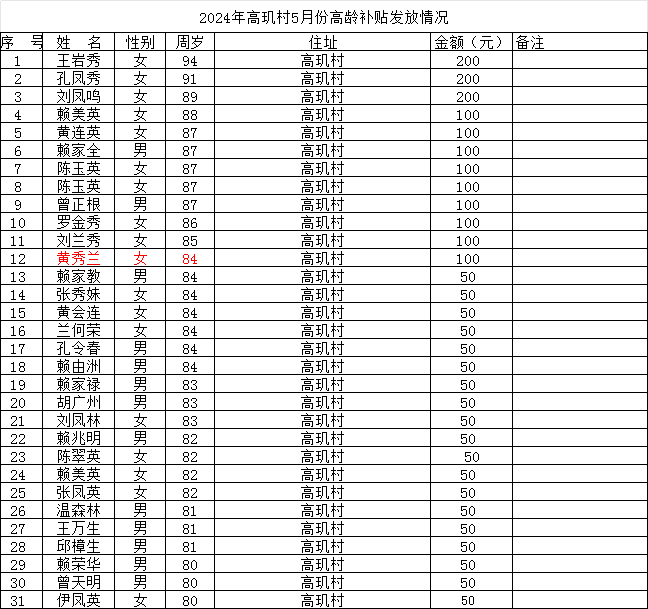 2024年高璣村5月份高齡補(bǔ)貼發(fā)放情況