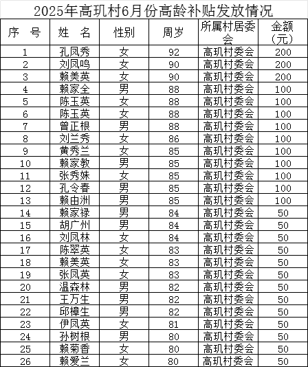 2025年高璣村6月份高齡補貼發(fā)放情況