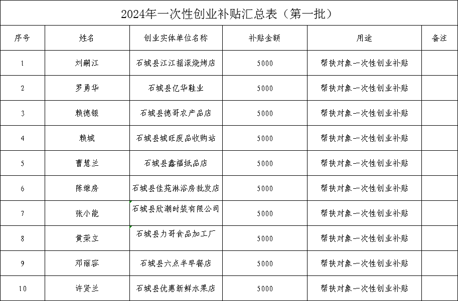 石城縣2024年幫扶對(duì)象一次性創(chuàng)業(yè)補(bǔ)貼撥付公示表(第一批)