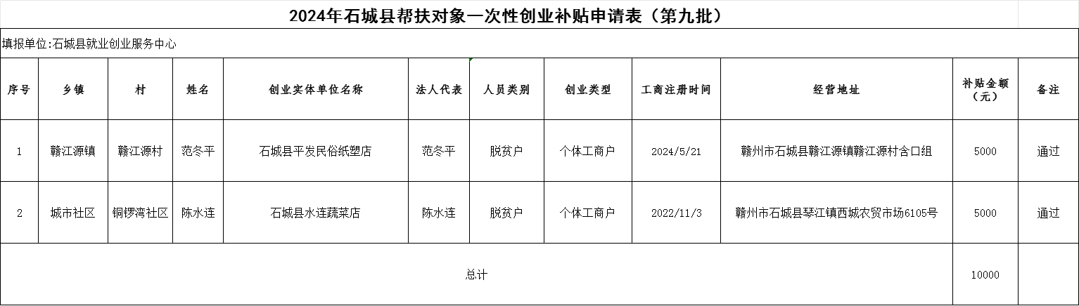 石城縣2024年幫扶對象一次性創(chuàng)業(yè)補貼撥付公示表(第九批)