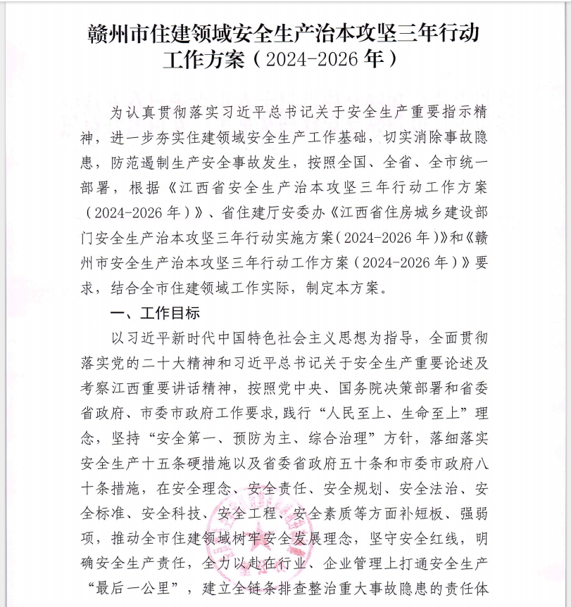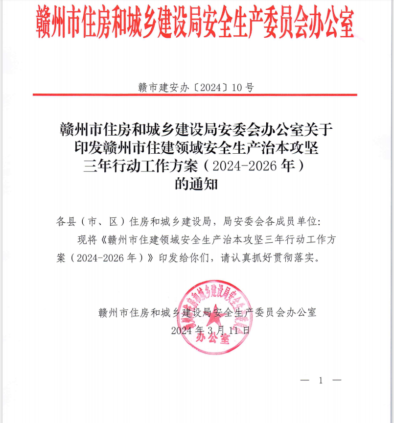 贛州市住房和城鄉(xiāng)建設(shè)局關(guān)于印發(fā)贛州市住建領(lǐng)域安全生產(chǎn)治本攻堅(jiān)三年行動(dòng)工作方案的通知
