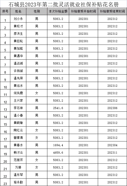根據(jù)贛財(cái)社﹝2019﹞1號(hào)文件,現(xiàn)將2023年第二批“4050”就業(yè)困難人員靈活就業(yè)社保補(bǔ)貼資金擬撥付予以公示,公示期為7天,公示時(shí)間為:2023年6月30日-2023年7月6日,如有異議,請(qǐng)于公示期內(nèi)向石城縣就業(yè)創(chuàng)業(yè)服務(wù)中心提出意見(jiàn)。