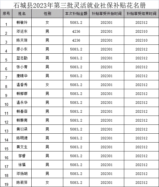 根據(jù)贛財(cái)社﹝2019﹞1號(hào)文件,現(xiàn)將2023年第三批“4050”就業(yè)困難人員靈活就業(yè)社保補(bǔ)貼資金擬撥付予以公示,公示期為7天,公示時(shí)間為:2023年6月30日-2023年7月6日,如有異議,請(qǐng)于公示期內(nèi)向石城縣就業(yè)創(chuàng)業(yè)服務(wù)中心提出意見。