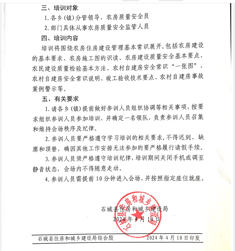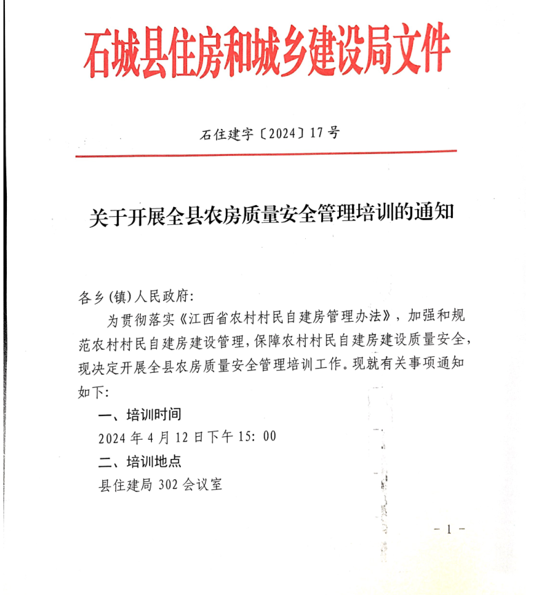 關(guān)于開展全縣農(nóng)房質(zhì)量安全管理培訓(xùn)的通知