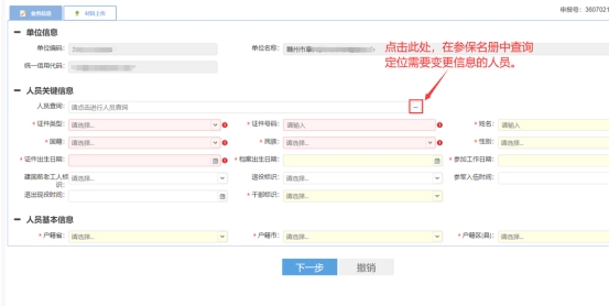 步驟二:人員查詢右側的【...】按鈕選擇參保人員→進行相關的信息維護→在材料上傳頁面根據(jù)以下情況上傳對應的材料→完成顯示申報告知單,點擊完成即該項業(yè)務受理成功,待社保工作人員審核。
