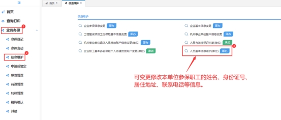 步驟一:點擊左側事項列表的業(yè)務辦理→信息維護,點擊人員基本信息維護(單位)(變更修改本單位參保職工姓名、身份證號、地址、聯(lián)系電話等信息)模塊。