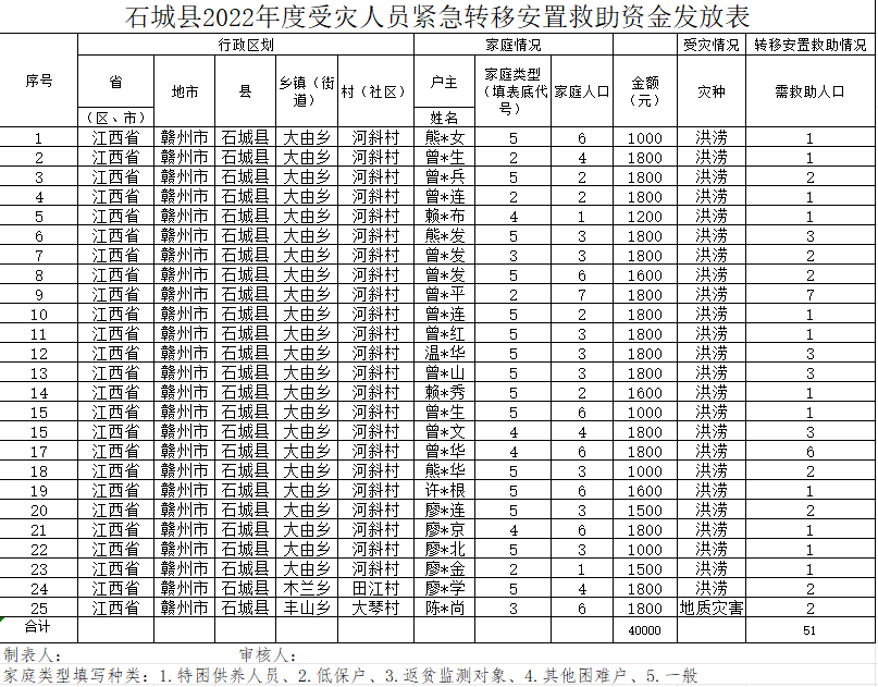 石城縣2022年度受災(zāi)人員緊急轉(zhuǎn)移安置救助資金發(fā)放表