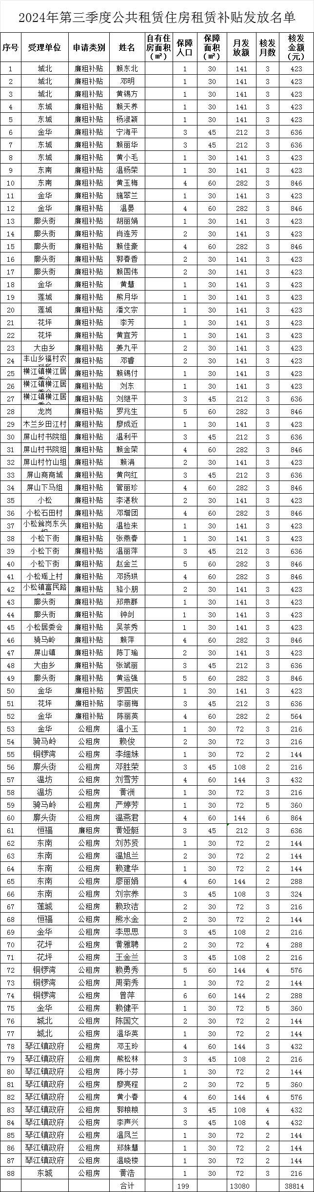 2024年第三季度公共租賃住房租賃補(bǔ)貼發(fā)放名單
