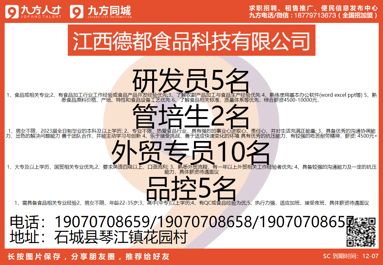 【江西德都食品科技有限公司】招聘研發(fā)員、管培生、外貿(mào)專員、品控