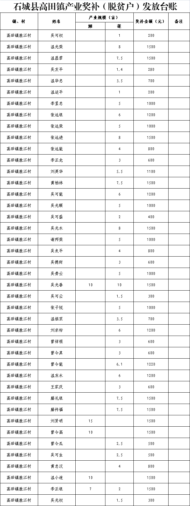 【產(chǎn)業(yè)扶持】高田鎮(zhèn)勝江村產(chǎn)業(yè)獎(jiǎng)補(bǔ)(脫貧戶)發(fā)放臺(tái)賬(2022年度第一批)