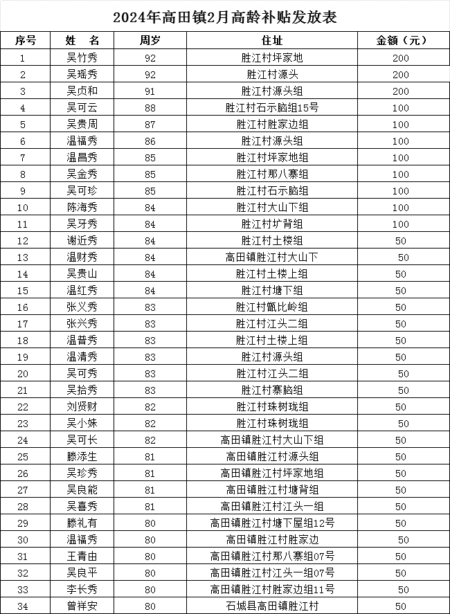 【老年人申領(lǐng)補貼和發(fā)放信息】2024年高田鎮(zhèn)勝江村2月高齡補貼發(fā)放表