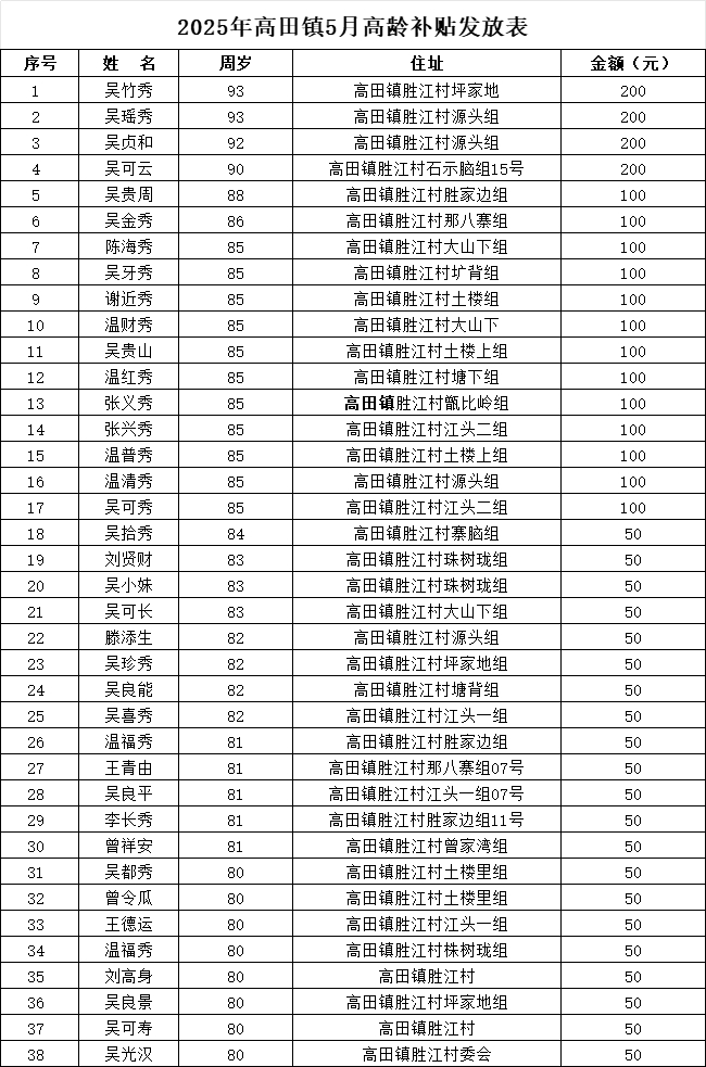 【老年人申領(lǐng)補(bǔ)貼和發(fā)放信息】2025年高田鎮(zhèn)勝江村5月高齡補(bǔ)貼發(fā)放表