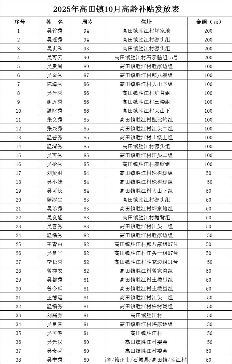 【老年人申領補貼和發(fā)放信息】2025年高田鎮(zhèn)勝江村10月高齡補貼發(fā)放表