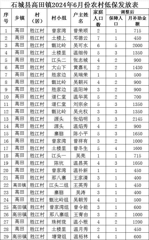 【最低生活保障】石城縣高田鎮(zhèn)勝江村2024年6月份農(nóng)村低保發(fā)放公示
