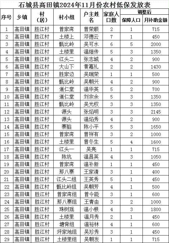 【最低生活保障】石城縣高田鎮(zhèn)勝江村2024年11月份農(nóng)村低保發(fā)放公示